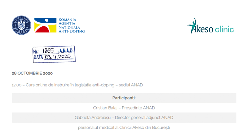 Specialiştii care activează în cadrul Akeso clinic au urmat cursuri de instruire în ceea ce priveşte legislaţia anti-doping. Diagnosticul şi tratamentul recomandat de acesţia fiind în acord cu legislaţia în vigoare.